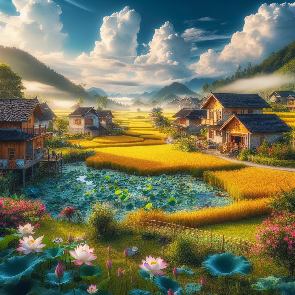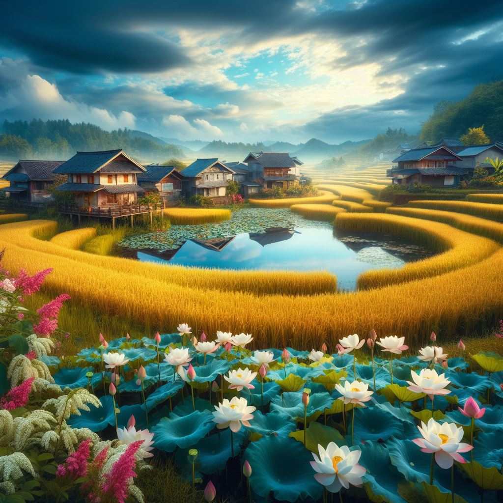 A peaceful village with brilliant golden rice fields. Under the cool blue sky, there are houses around, trees and flowers blooming. Next to it is the lotus pond, where lotus flowers have bloomed brilliantly, creating a beautiful and lyrical scene