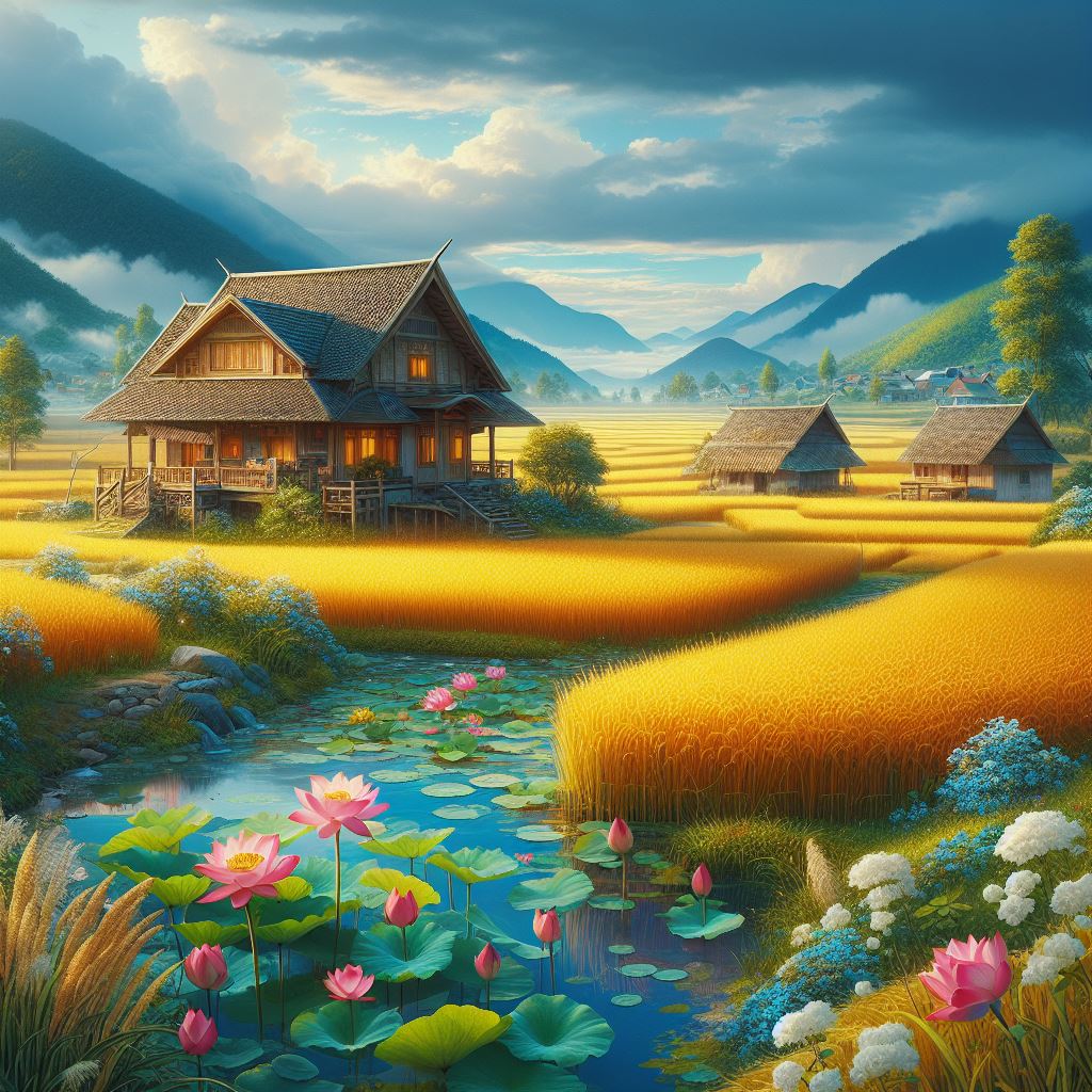 Một làng quê yên bình với cánh đồng lúa vàng rực rỡ. Dưới bầu trời xanh mát có nhà cửa xung quanh, cỏ cây và hoa lá đua nở. Bên cạnh là hồ sen, nơi những bông hoa sen đã nở rực rỡ, tạo nên một khung cảnh đẹp đẽ và trữ tình.