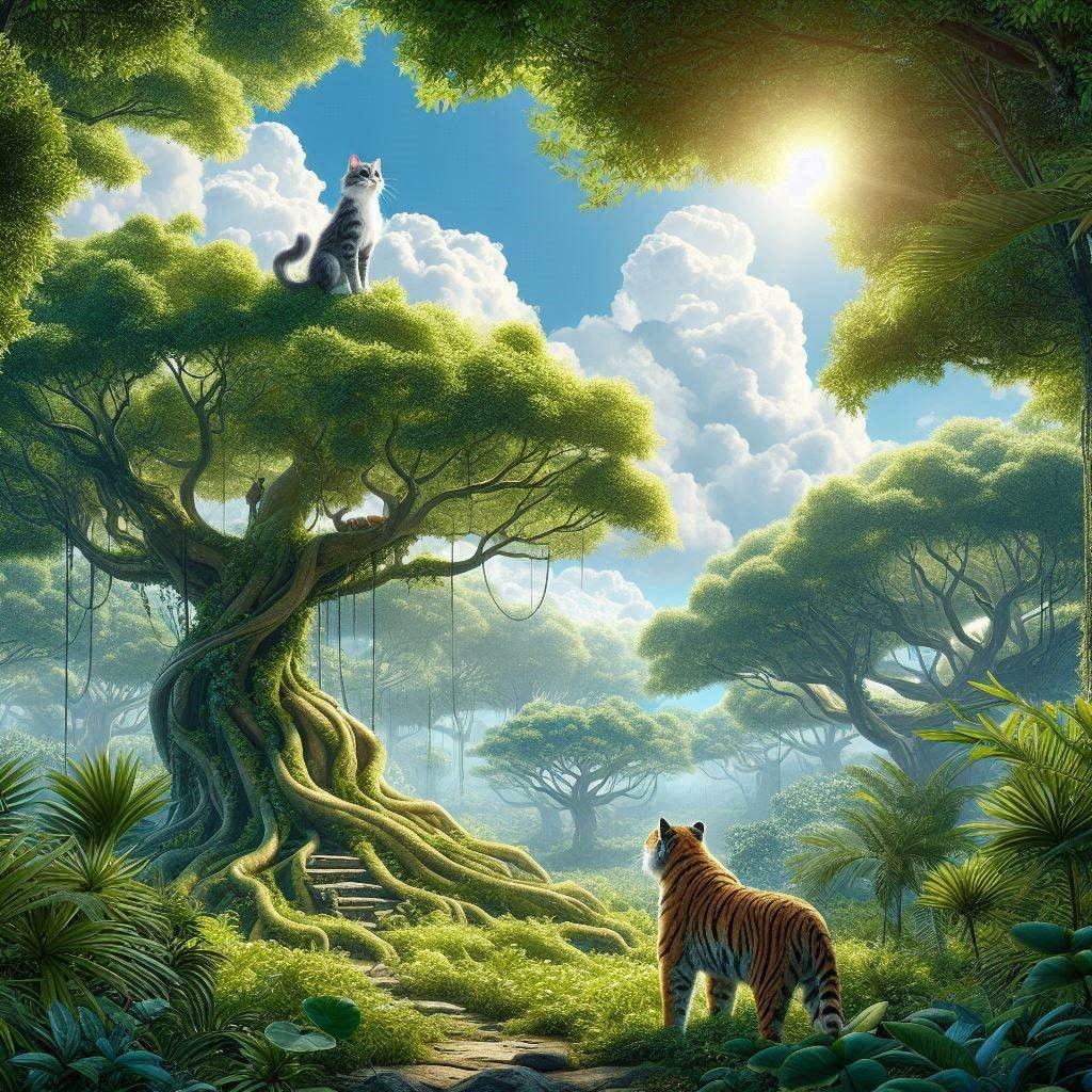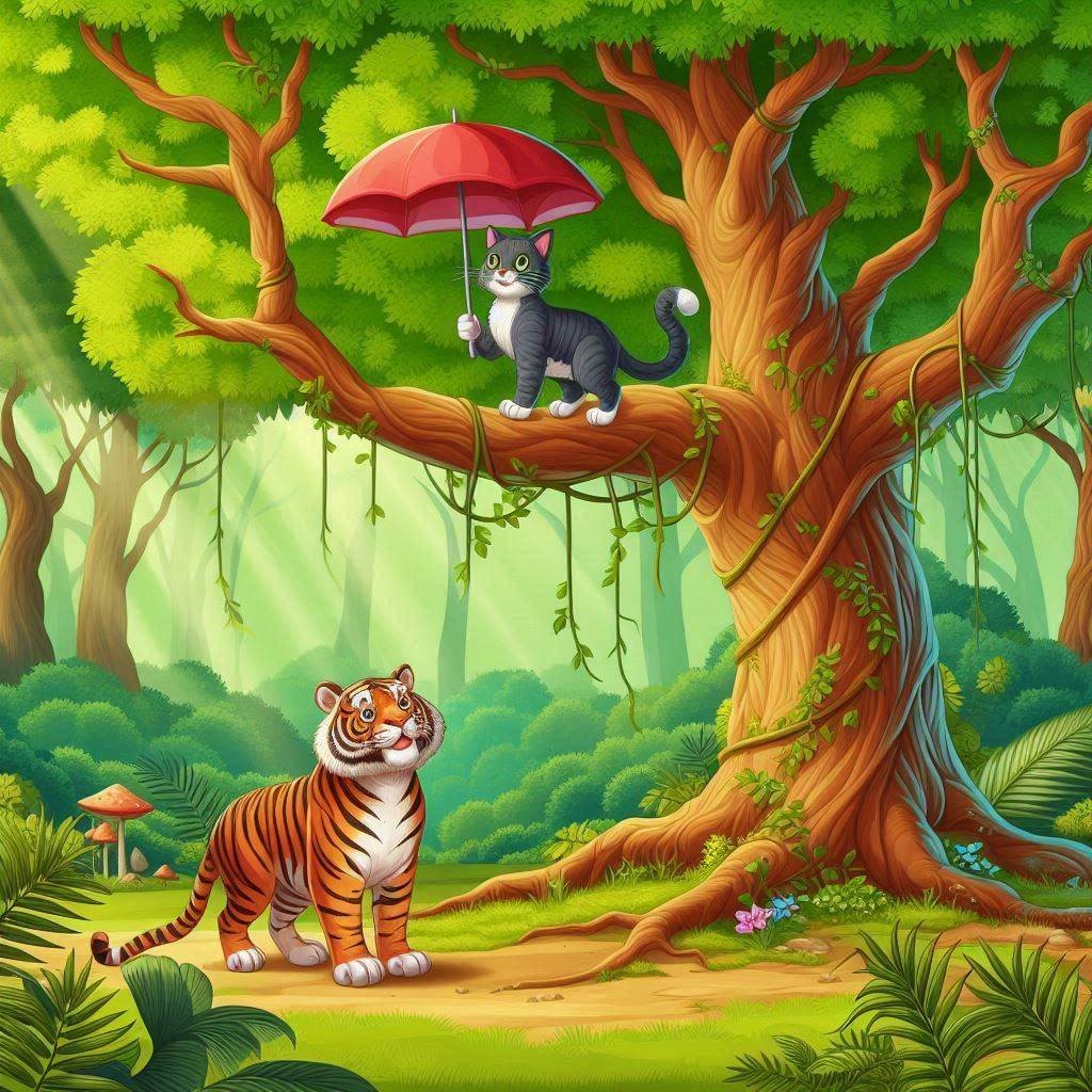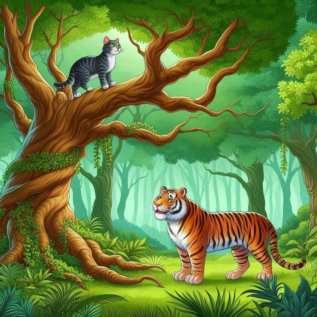 Trong rừng cây xanh, mặt trời bắt đầu chiếu những tia nắng qua kẽ lá. Cây cối mọc um tùm. Một con mèo đang đứng trên một cây to nhìn dưới gốc cây có một con hổ đang ngước mắt lên nhìn mèo.