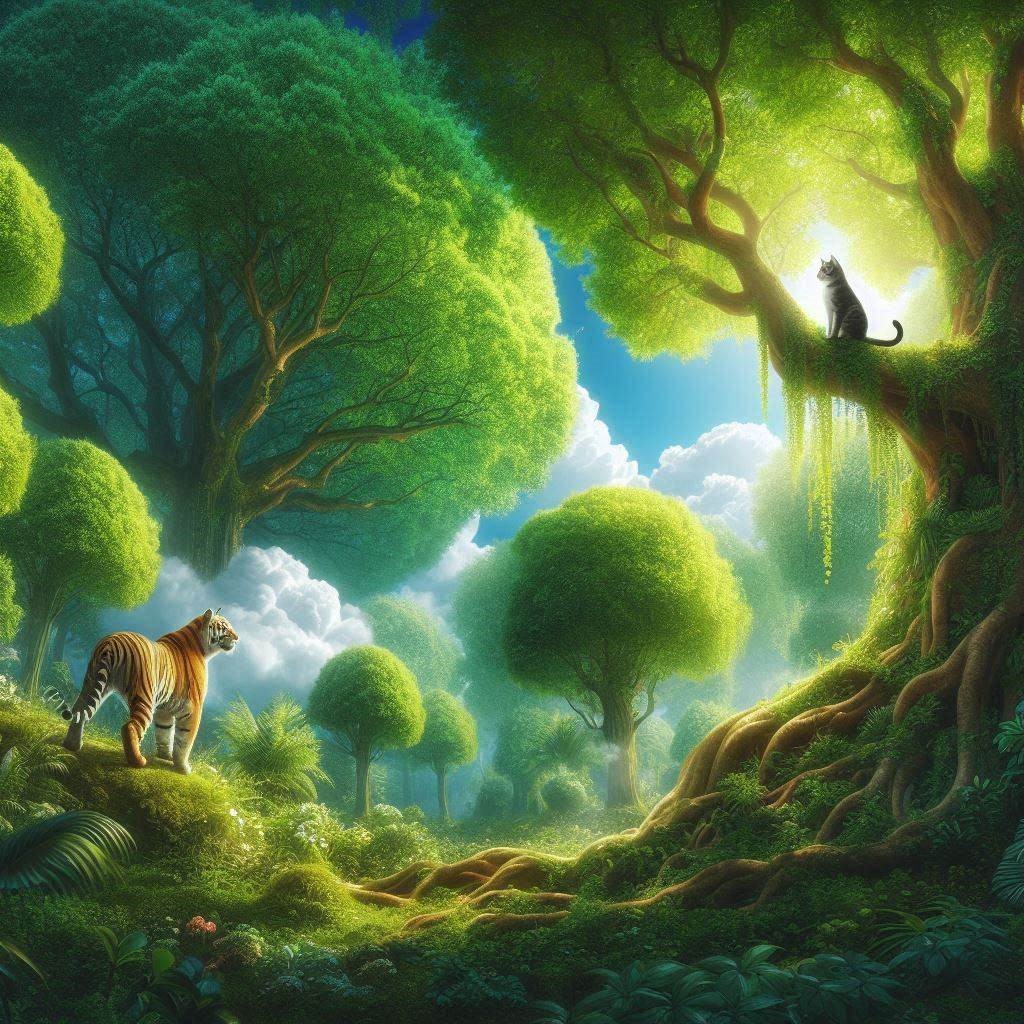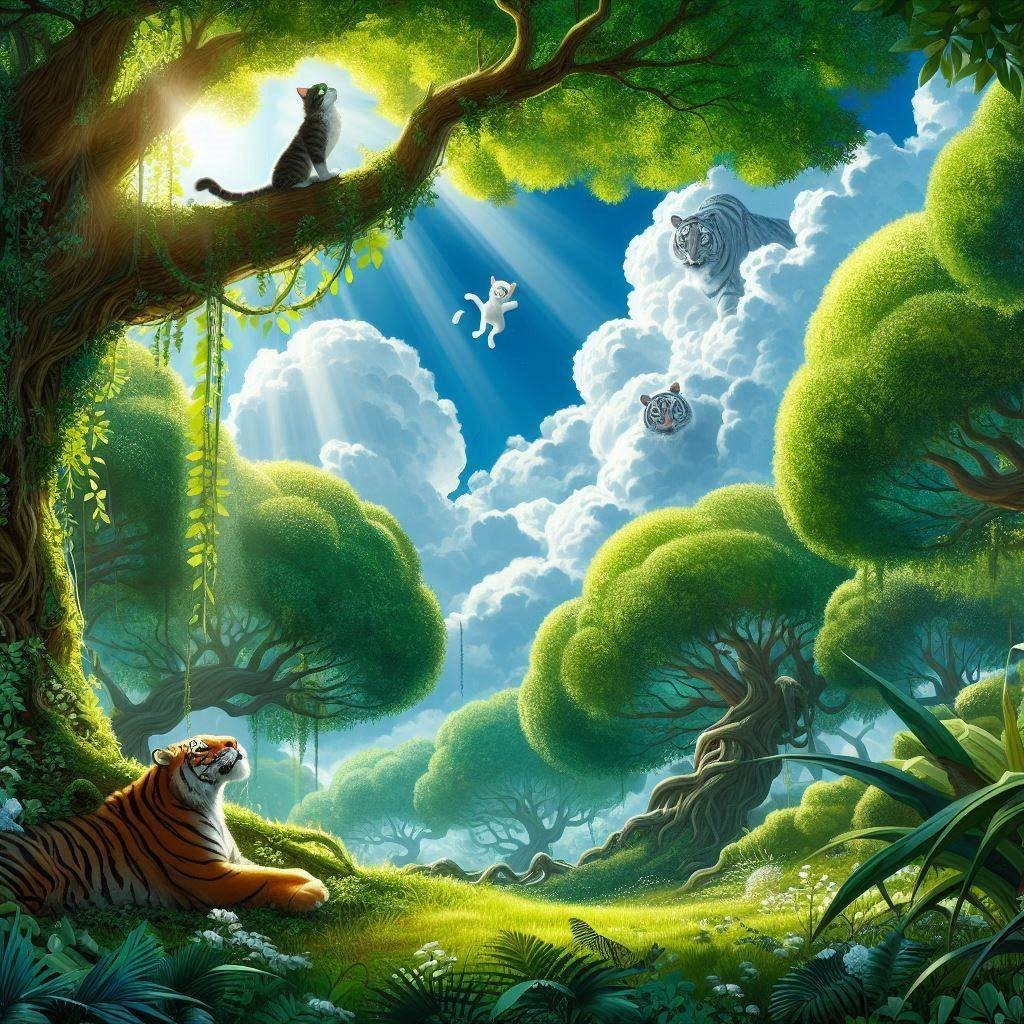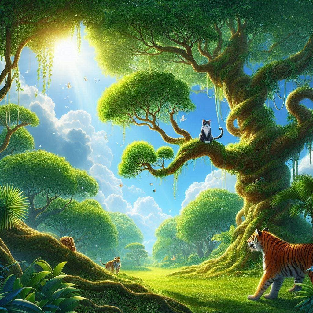 Trong rừng cây xanh, mặt trời bắt đầu chiếu những tia nắng qua kẽ lá. Cây cối mọc um tùm. Một con mèo đang đứng trên một cây to nhìn dưới gốc cây có một con hổ đang ngước mắt lên nhìn mèo.
