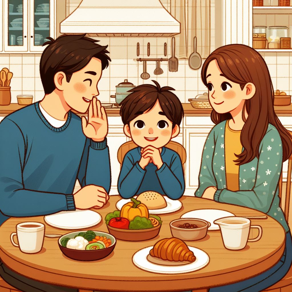 Tranh vẽ khunh cảnh trong một ngôi nhà có ba người: bố, mẹ và một bạn nam. Hình ảnh gia đình đang quây quần bên bữa cơm, bạn nhỏ ghé tai kể chuyện cho mẹ nghe, bố với nét mặt vui vẻ nhìn hai mẹ con. Cả nhà đang ngồi ăn trong nhà bếp với chiếc bàn gỗ tròn. Trên bàn có những món ăn ngon.