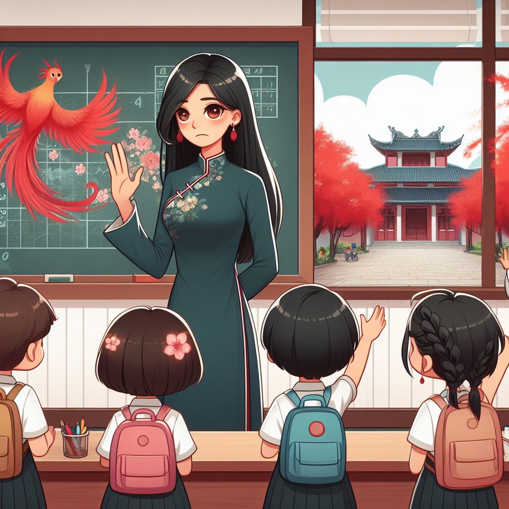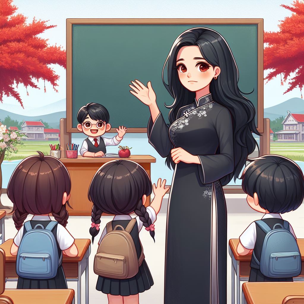 Tranh vẽ một cô giáo tóc đen, mặc áo dài đứng bên cạnh bảng đen trong lớp học với nét mặt buồn rầu trong lớp học. Bốn bạn học sinh xung quanh cô giáo mặc quần áo đồng phục, đeo cặp sách, các bạn nữ dễ thương tết tóc hai bên đang vẫy tay chào cô giáo. Xa xa là hình ảnh sân trường với những cây phượng đỏ rực.