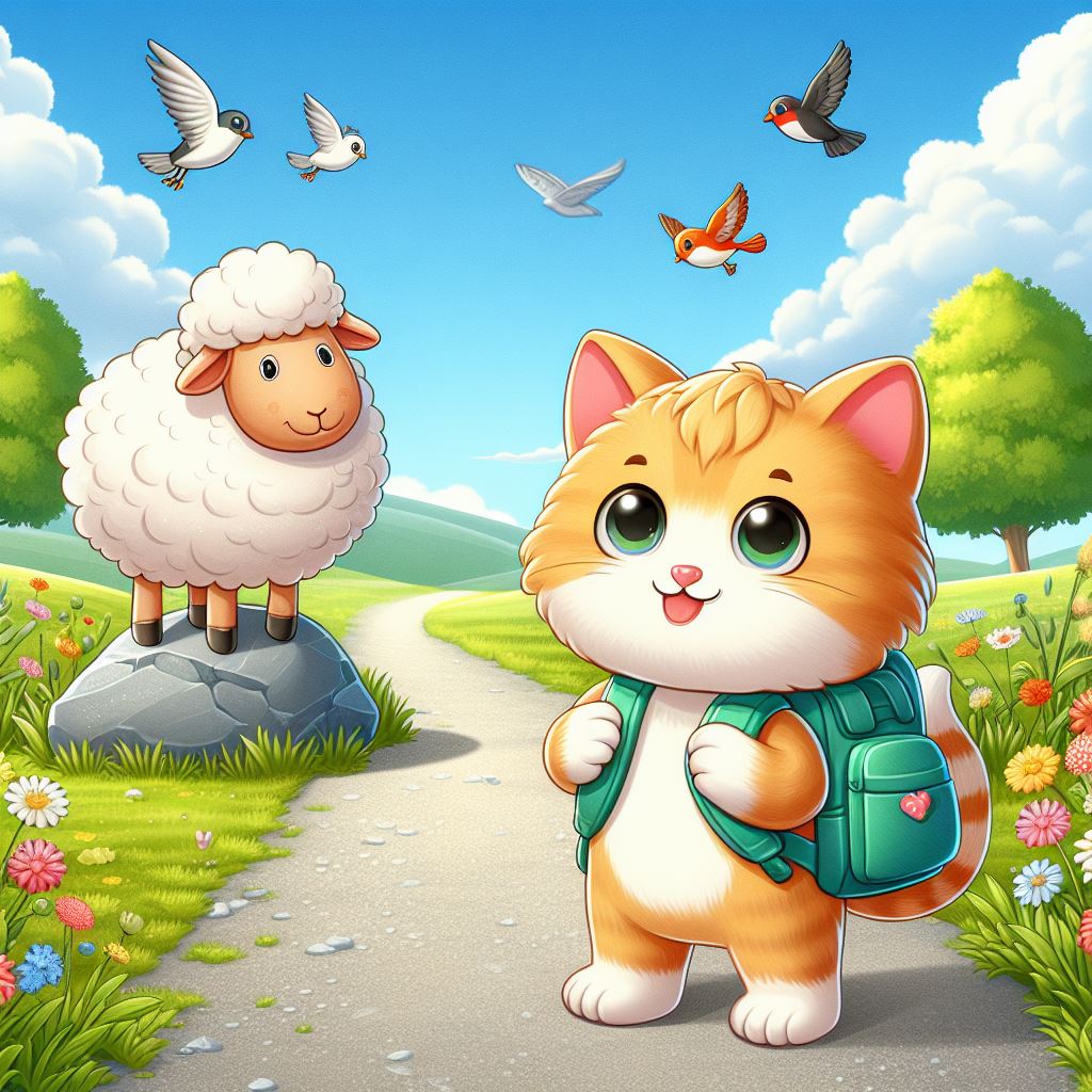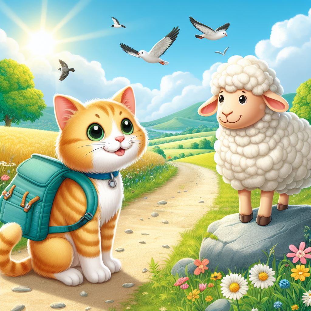 Tranh vẽ một chú mèo lông vàng đeo cặp sách trên đường đi đến trường. Khung cảnh đường đến trường có một đồng ruộng nhiều cây cối, chim bay, hoa mọc ven đường, ánh nắng chói chang. Chú mèo gặp bác cừu với bộ lông trắng đứng bên một tảng đá với nét mặt vui vẻ.